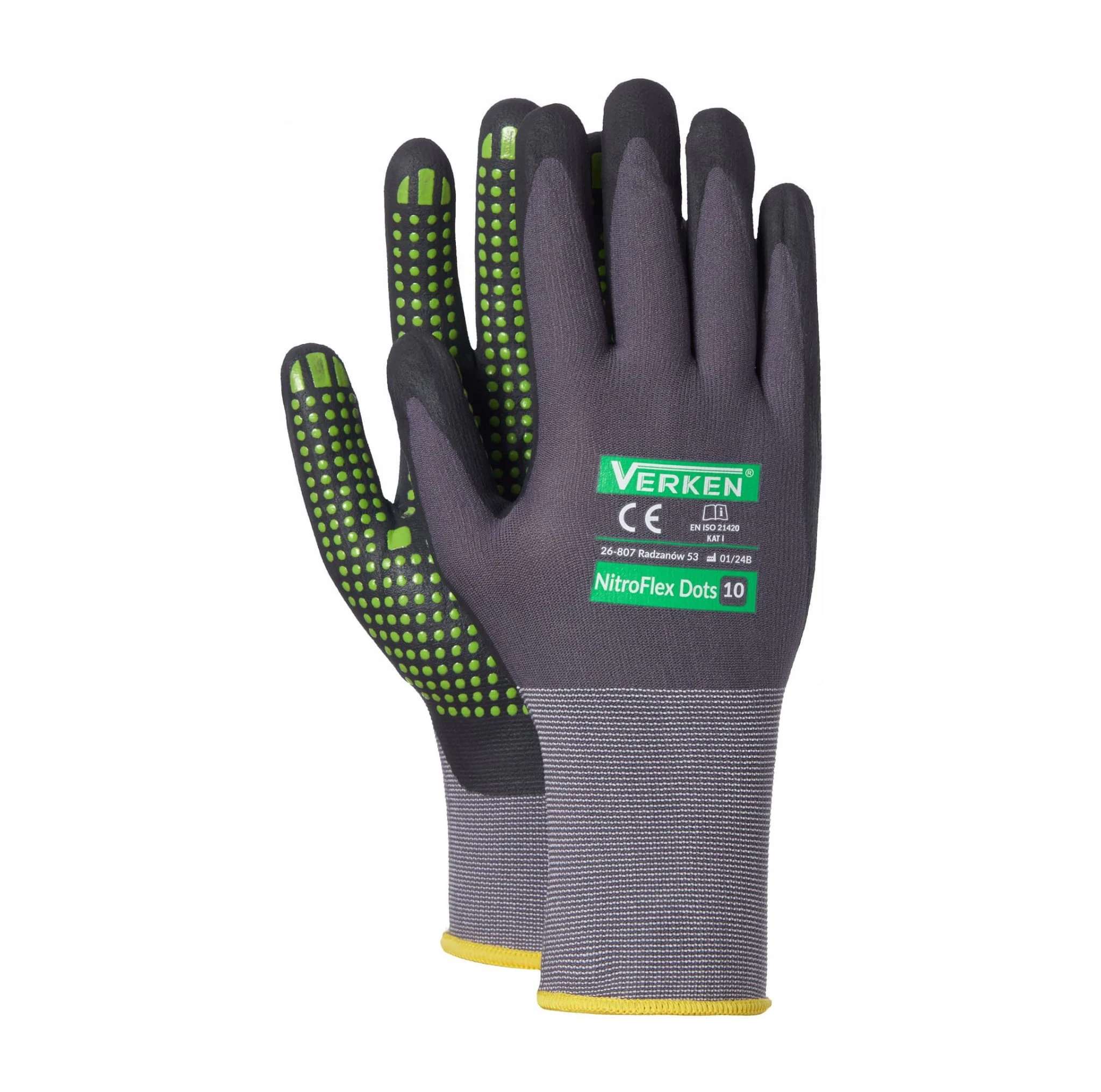 Profesjonalne rękawice ochronne Verken NitroFlex Dots to zaawansowane rozwiązanie dla osób poszukujących bezkompromisowej precyzji i pewnego chwytu. Dzięki połączeniu ultralekkiej dzianiny o wysokim ściegu 15G z innowacyjnym nakropieniem PVC na mikropiance nitrylowej, rękawice te oferują czucie detali porównywalne z pracą gołą dłonią, przy zachowaniu wysokiej ochrony mechanicznej.